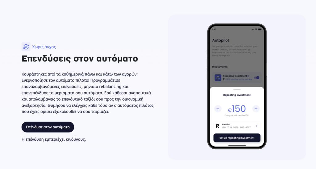 Τέλος, με το Portfolio Builder φτιάχνεις ένα custom, διαφοροποιημένο χαρτοφυλάκιο σε λίγα βήματα (επιλέγοντας asset classes, γεωγραφία, κλάδους και επενδυτικό στυλ, ξεκινώντας και από templates), και μετά με το Autopilot το βάζεις στον “αυτόματο πιλότο” κάνοντας επαναλαμβανόμενες μηνιαίες επενδύσεις και αυτόματη εξισορρόπιση ώστε να μένει κοντά στην κατανομή που έχεις ορίσει.