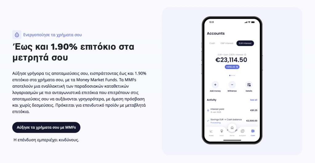Με το Portfolio Builder μπορείς να φτιάξεις ένα προσωποποιημένο και διαφοροποιημένο χαρτοφυλάκιο με βάση το δικό σου προφίλ ρίσκου ενώ με το Autopilot μπορείς να δημιουργήσεις επαναλαμβανόμενες μηνιαίες επενδύσεις και αυτοματοποιημένο rebalancing. Τέλος, μέσω των Saving Accounts λαμβάνεις παθητικό επιτόκιο στα μετρητά σου από 1.8% έως 1.9% μέσω MMFs της Blackrock.