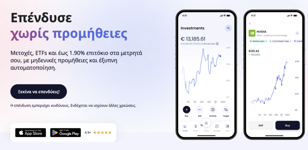 Εάν αναζητάς μια εφαρμογή για μακροχρόνιες επενδύσεις σε μετοχές (αλλά και ETFs), με μηδενικές προμήθειες αγοράς και πώλησης η οποία να έχει έδρα και να εποπτεύεται στην Ελλάδα, τότε θα μπορούσες να της ρίξεις μια ματιά.